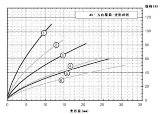 | Curve number | Model | Maximum static load(N) | Maximum deformation(mm) | Vibration stiffness KN/m) | Impact stiffness(KN/m) |